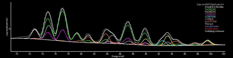 Shown here is a portion of a spectrum of mineral deposits in a pipe from a copper mine. The actual data can be seen as a "stair-step" histogram in light gray. Fitted decay chain shapes are in different colors corresponding to the colors of the text in the legend. The mineral deposits were shown to have significant concentrations of natural radionuclides, primarily radium, that were not in secular equilibrium. The spectrum was analyzed with VRF, our premier analysis program. The remarkable deconvolution of peaks is made possible by our technique of fitting each of many full-spectrum decay-chain shapes with non-linear least-squares rather than beginning with the results of a simple peak search as is done by traditional analysis programs.